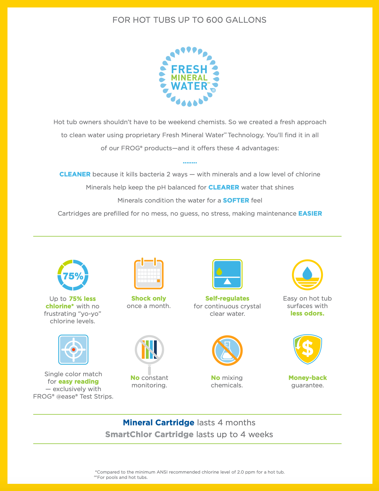 If you’re ready to elevate your spa care, the FROG ease mineral cartridge for hot tub and SmartChlor cartridge combo delivers lasting results and consistent water clarity. Trusted by spa owners for its simplicity and effectiveness, Frog Ease products make maintaining your hot tub easier than ever.